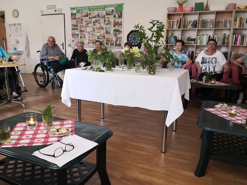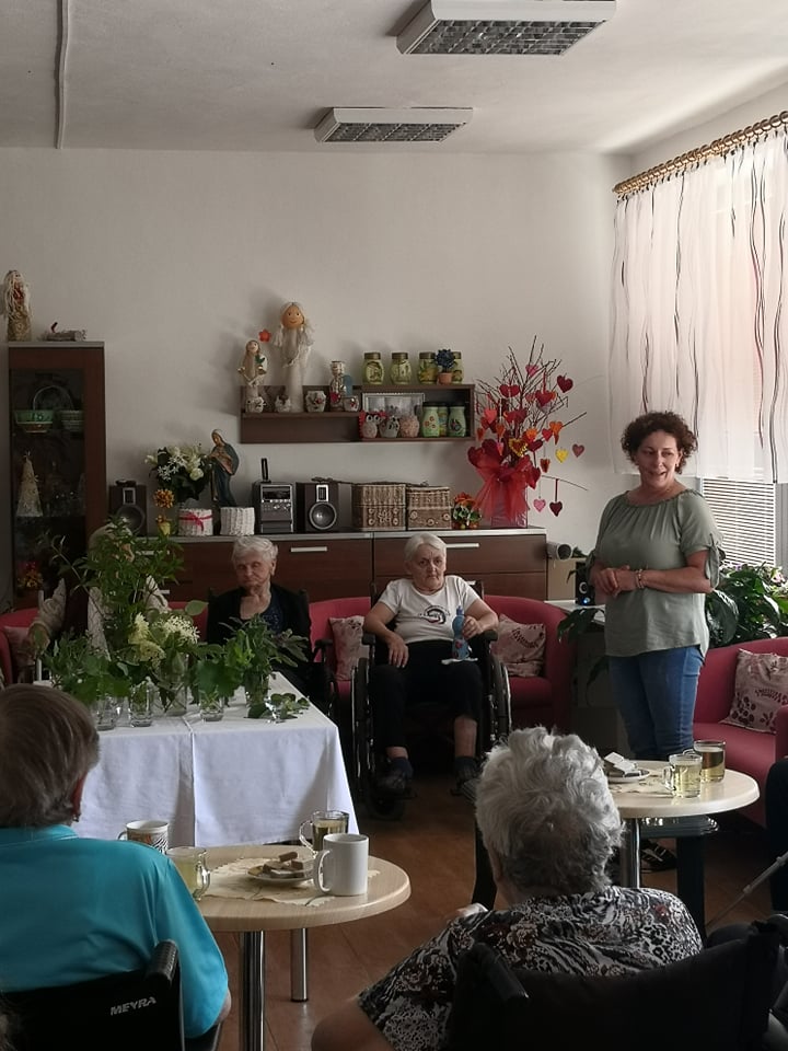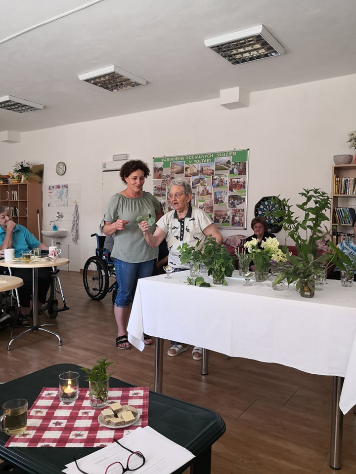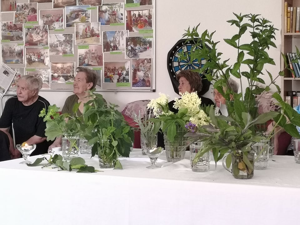 Vôňa čerstvo natrhaných byliniek a chutný bylinkový čaj rozvoňali spoločenskú miestnosť. Obyvatelia si bylinky prezerali, skúmali ich vôňu a postupne sa rozpamätávali na ich názvy a liečivé účinky. Príjemné dopoludnie sme ukončili prednáškou o pitnom režime v letnom období.