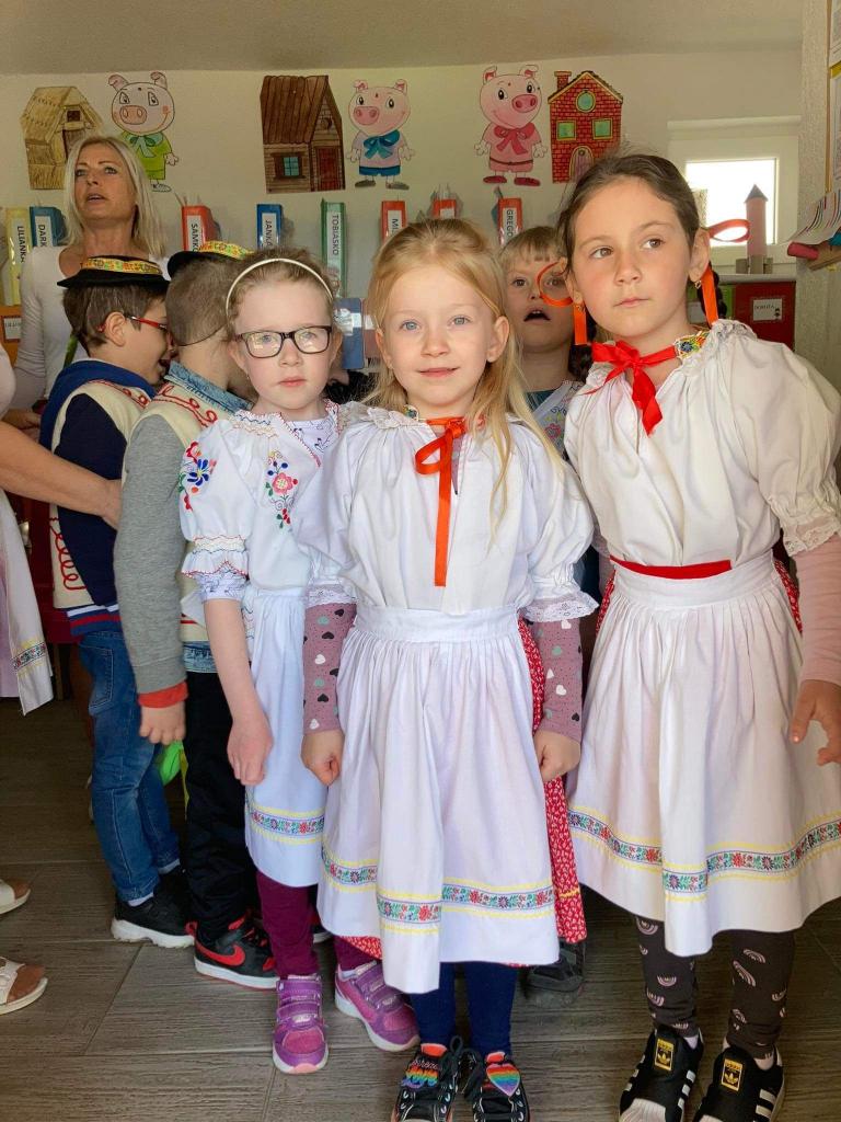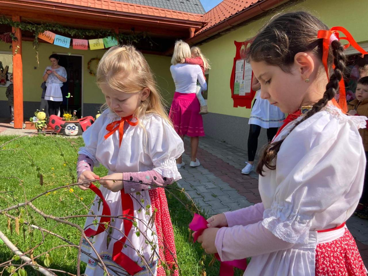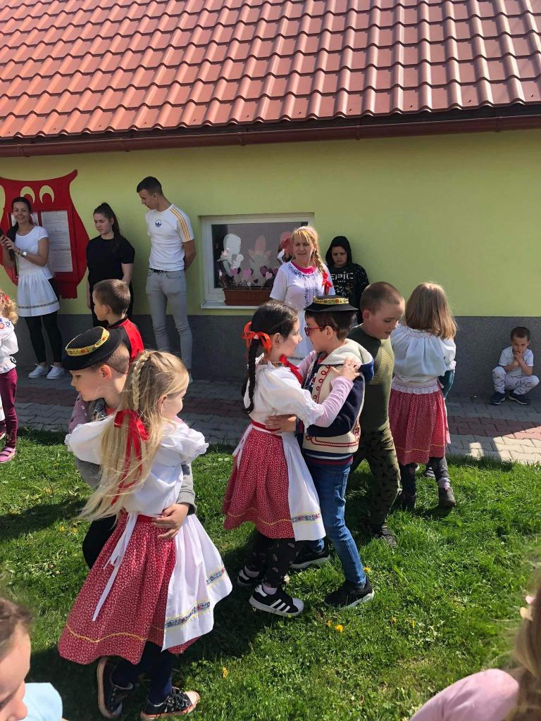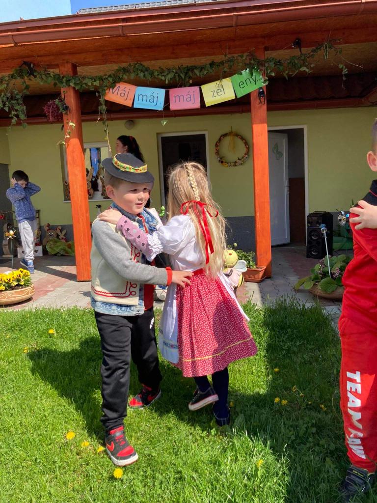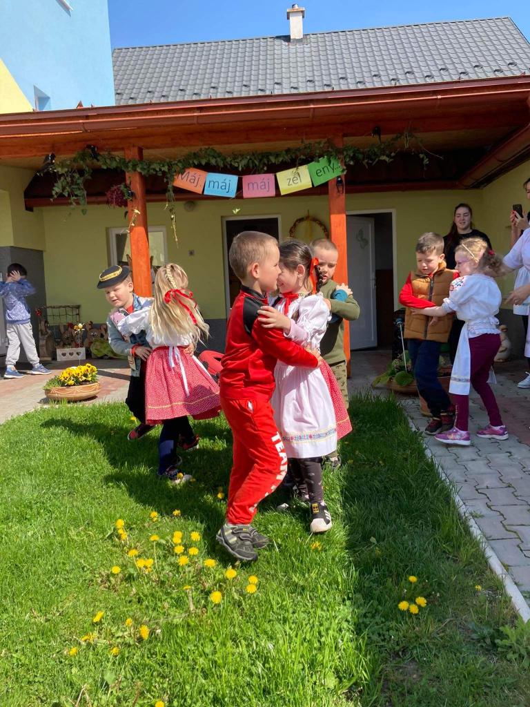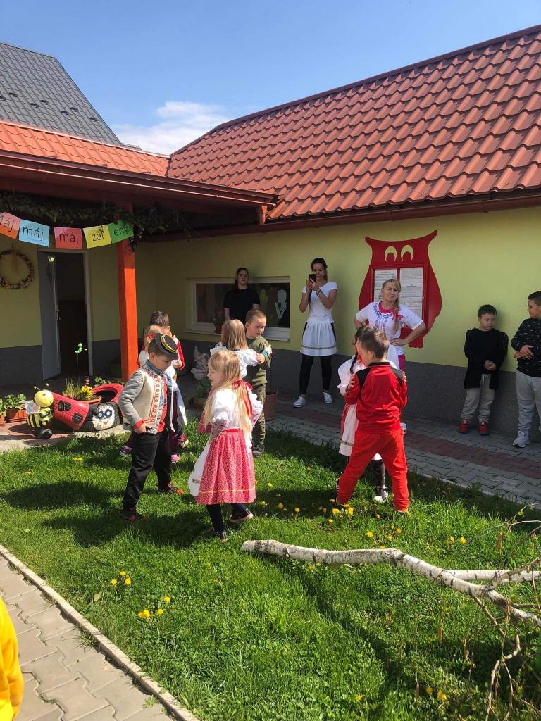 Dievčatá a chlapci - predškoláci vyobliekaní do pestrofarebných krojov sa na školskom dvore zapojili do zdobenia mája farebnými stužkami. Všetky dievčatá spoločným úsilím vyzdobili máj. Potom sme ho upevnili pri bráne našej MŠ. Pri veselej hudbe a tanci „Staviame my máje“, „Tancuj, tancuj vykrúcaj“, „Po nábreží koník beží“, „Dínom, dánom“ sa deti pochytali za ruky a spolu s pani učiteľkami si tancom a spevom piesní uctili túto tradíciu. Dobrá nálada nevymizla z tvárí detí po celý deň. Veríme, že táto tradícia nezaostane ani po nasledujúce roky a máje budú i naďalej zdobiť exteriér našej MŠ. Posúďte sami, veď z tvárí detí žiari úsmev, ako májový dar pre nás všetkých.