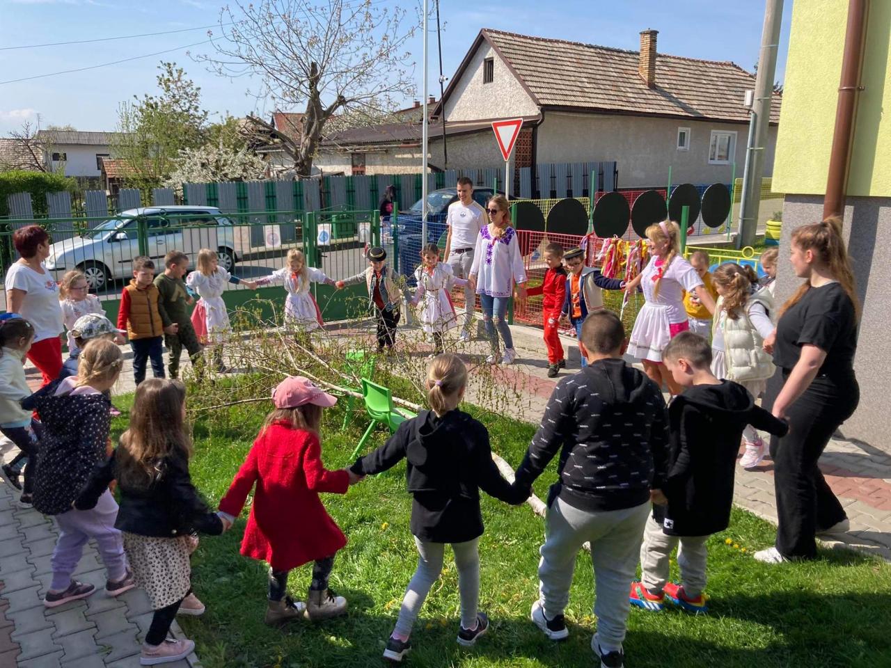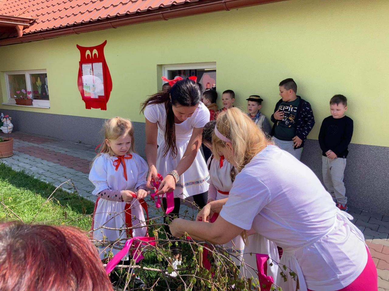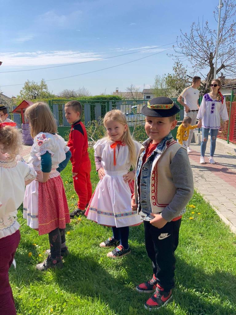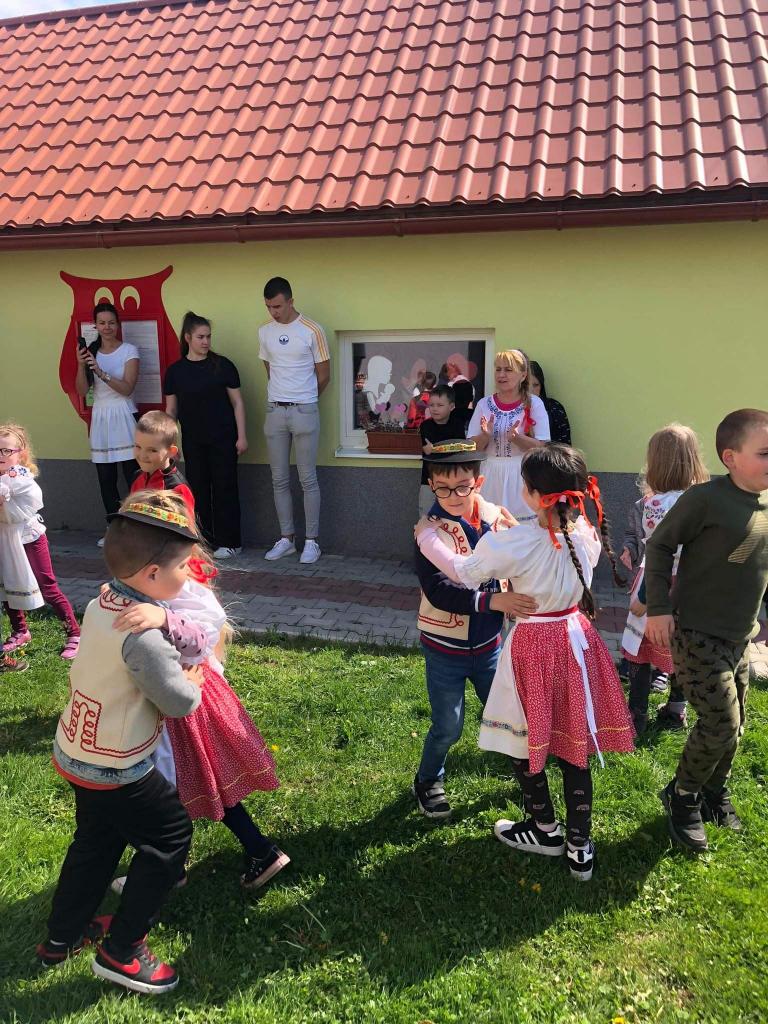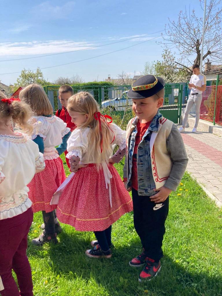Dievčatá a chlapci - predškoláci vyobliekaní do pestrofarebných krojov sa na školskom dvore zapojili do zdobenia mája farebnými stužkami. Všetky dievčatá spoločným úsilím vyzdobili máj. Potom sme ho upevnili pri bráne našej MŠ. Pri veselej hudbe a tanci „Staviame my máje“, „Tancuj, tancuj vykrúcaj“, „Po nábreží koník beží“, „Dínom, dánom“ sa deti pochytali za ruky a spolu s pani učiteľkami si tancom a spevom piesní uctili túto tradíciu. Dobrá nálada nevymizla z tvárí detí po celý deň. Veríme, že táto tradícia nezaostane ani po nasledujúce roky a máje budú i naďalej zdobiť exteriér našej MŠ. Posúďte sami, veď z tvárí detí žiari úsmev, ako májový dar pre nás všetkých.