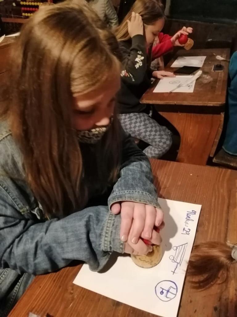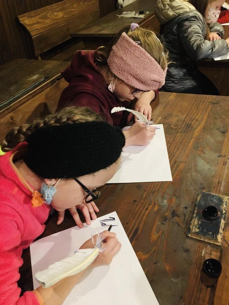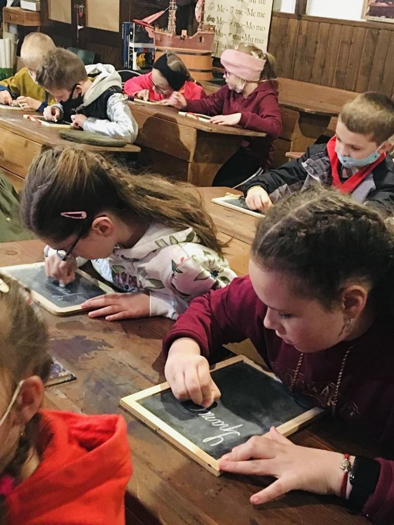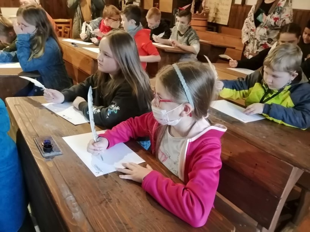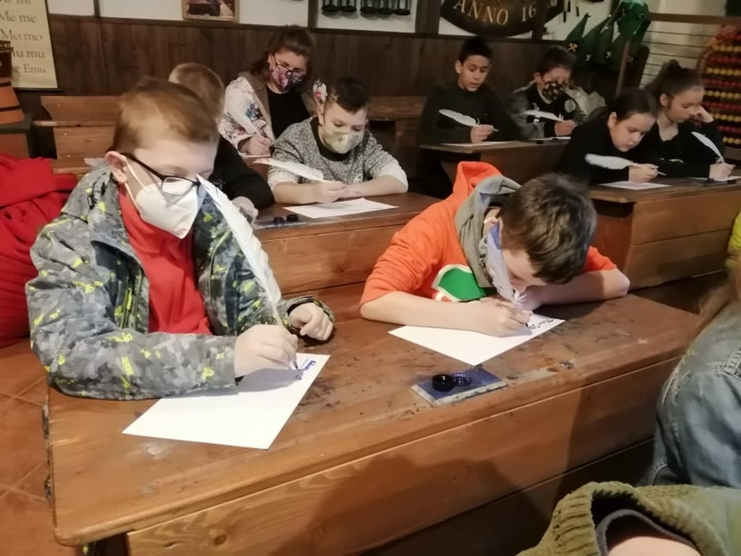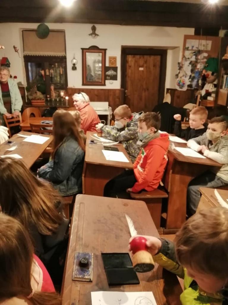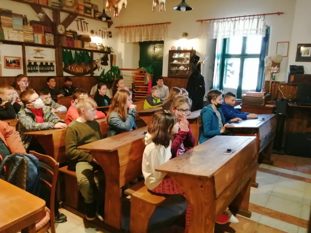 V interiéri historickej školy sa žiakom vrátil život o sto rokov dozadu. Od pani sprievodkyne sa žiaci dozvedeli zaujímavé informácie o obci, o jej obyvateľoch v tomto regióne. V triede, ktorá mala autentickú podobu, si žiaci mali možnosť vyskúšať na vlastnej koži, ako sa v dávnej minulosti učilo. Medený zvonček oznamujúci začiatok a koniec vyučovacej hodiny, pôvodné drevené lavice spojené stoličkami, piecka, veľké počítadlo, učebnice z minulého storočia, plechové historické umývadlo a pre neposlušné deti aj trstenica, či tvrdé polienko na kľačanie priblížili kus histórie učenia kedysi. Kalamáre s atramentom, do ktorých sa namáčajú pierka a tabuľky, na ktoré sa píše kriedou.
