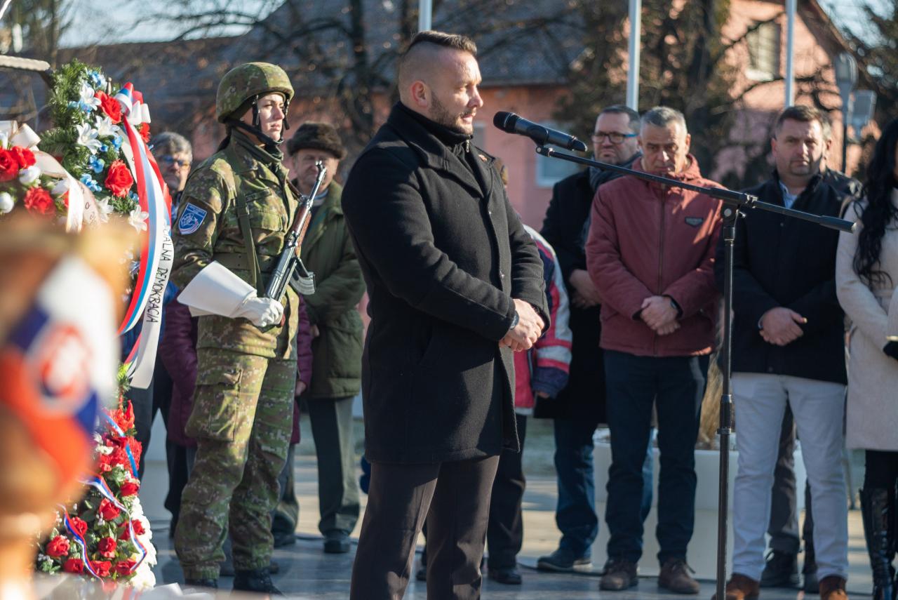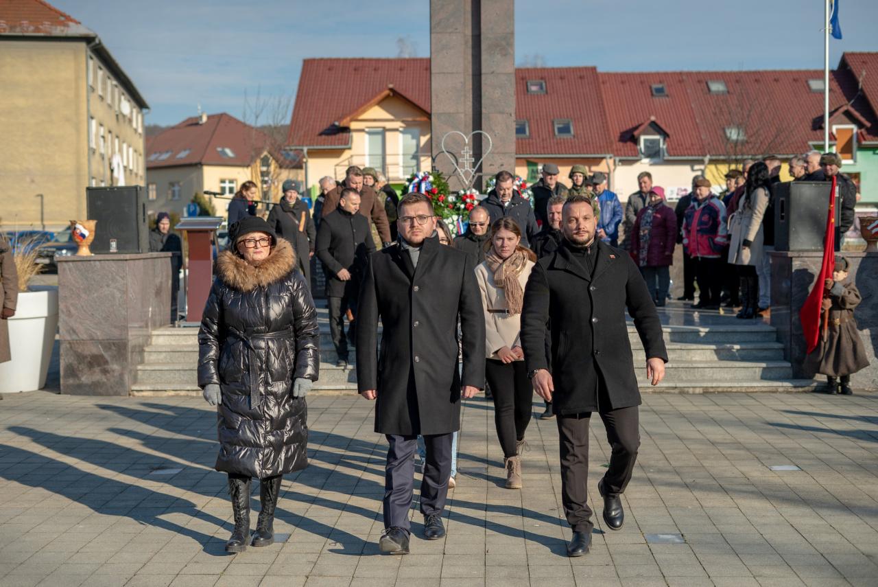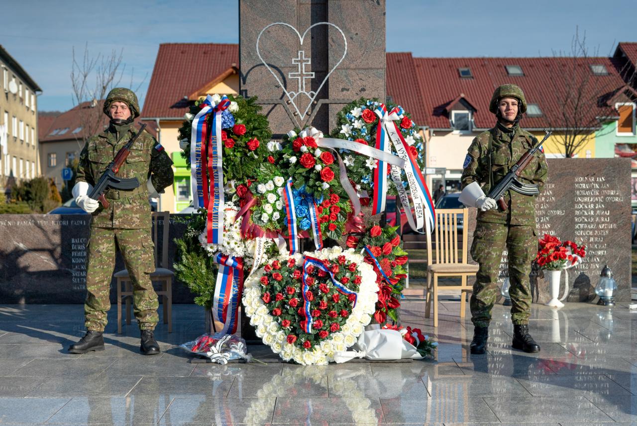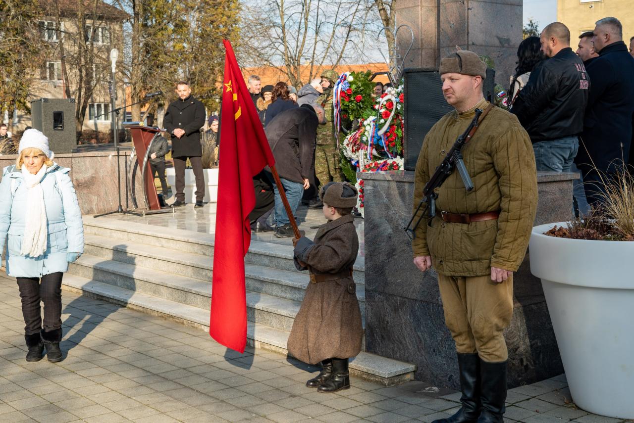 Na námestí bolo počuť slovenskú i sovietsku hymnu. „Históriu si treba pripomínať presne tak ako bola a faktom je že nás oslobodila sovietska červená armáda,“ uviedol primátor mesta s tým, že národy, ktoré si nevážia históriu, si nezaslúžia budúcnosť. Dobovú scénu dopĺňal aj chlapec v sovietskej uniforme, ktorý znázorňoval to, že vojna sa dotkla všetkých. O tom vie svoje povedať aj jeden z prítomných, člen SZPB Ladislav Kamenský, ktorý mal iba 6 rokov, keď v novembri 1944 nemeckí vojaci obsadili jeho rodičovský dom a spolu s rodičmi sa vo vlastnom dome stali iba hosťami. Na záver primátor poďakoval v ruskom jazyku priateľom z Veľvyslanectva ruskej federácie, ktorí prijali jeho pozvanie: „Spasiba!“ A tiež osobitne poďakoval štátnemu tajomníkovi MO SR Igorovi Melicherovi a všetkým, ktorí si prišli uctiť tento deň.
